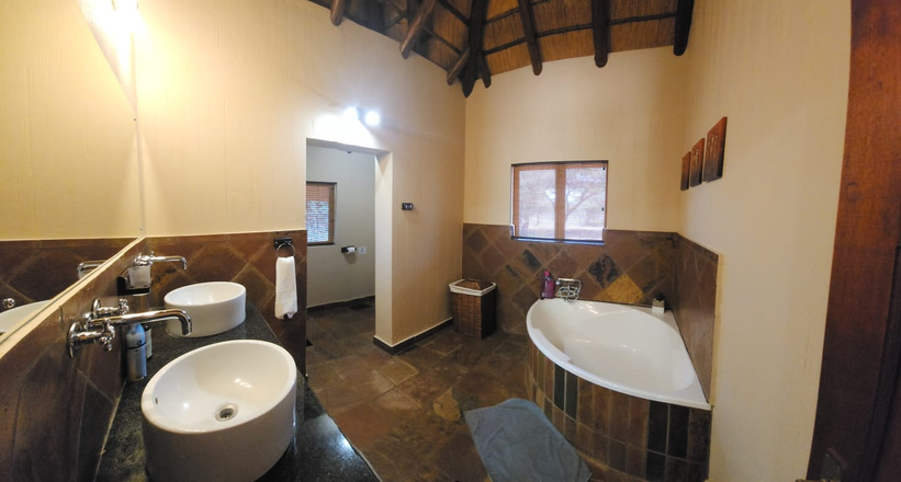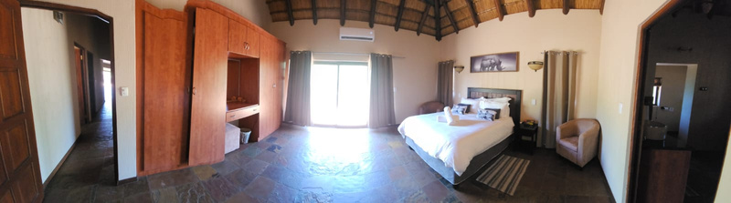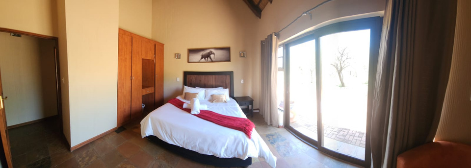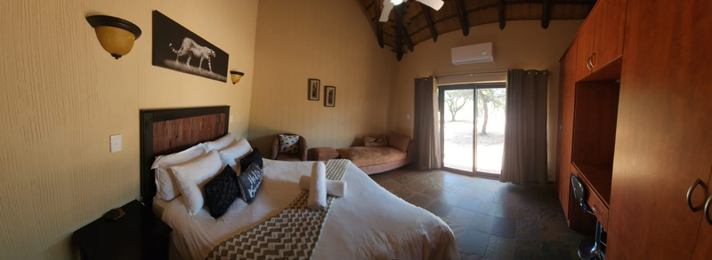 Queen size bed, vanity nook, air conditioner, ceiling fan